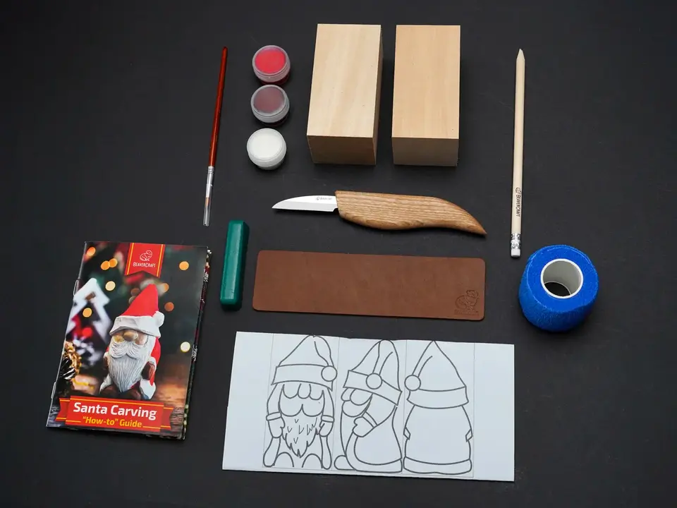 The result of DIY carving projects largely depends on your wood carving toolkit. Thanks to our all-in-one DIY06 Santa Carving Kit, you get all the tools, materials, and supplies you need for carving Santa Claus out of wood: a perfectly sharpened wood carving knife, two blocks of high-quality basswood, sharpening accessories (honing strop + polishing compound), protective no-cut tape, and art supplies (pencil, brush, and paints) to give your Santa DIY project a unique finished look.