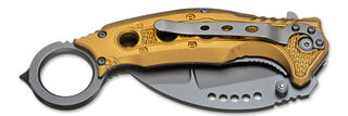 A real eye-catcher. The strong blade made of 440A steel, matte black, impressive with its shape and attractive milled texture. It is opened per thumb pin or flipper and aided by a spring. The liner lock holds the blade in place. The clip makes sure it is easy to reach. The handle scales are made of aluminum in coyote-color and pleasant to grip.
