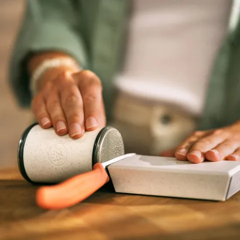 The permanently fitted stainless steel honing disc ensures a smooth knife edge after sharpening with the standard diamond disc. Thanks to the integrated grooves, you can remove any grinding dust in just a few strokes.