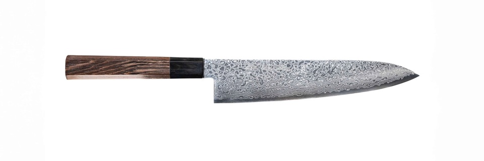 The Ginga series is crafted with a ZA-18 alloy core developed by Achi steel in Japan. This steel is slightly harder than VG-10 and heat treated to 61-63 HRC for phenomenal edge retention. This core is then covered with 68 layers of Damascus steel giving a stunning pattern to the blade. The word Ginga translates to Galaxy, a perfect description for this pattern. The handles are African Wenge with a buffalo horn ferrule. These knives are a work of art, razor sharp out of the box, nicely balanced and a joy to use for both the culinary professional and home cook who appreciate quality