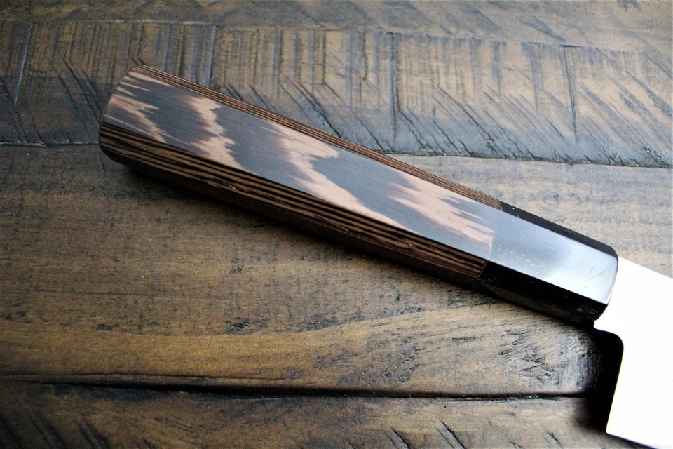 This is a Sakai Takayuki Western style series that is resistant to rust. This series is called Ginga which means Galaxy, evident by the stunning visual patterns on the blades. The handle is beautiful Wenge wood. Wenge is an African timber that has a beautiful black and gentle color tone and a unique delicate grain. It is known as very strong and hard wood.
