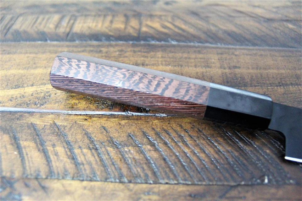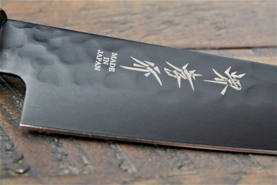 The blade has a hammer eye pattern. This knife has fluorine coating which is not easy to get dirty and resistant to rust. The blade repels water and oil, so easy to clean. The handle is beautiful wenge wood. Wenge is an African timber that has a beautiful black and gentle color tone and a unique delicate grain. It is known as very strong and hard wood. Please do not cut bone or frozen food. It may cause the knife to chip or other damaged. No dishwasher please.