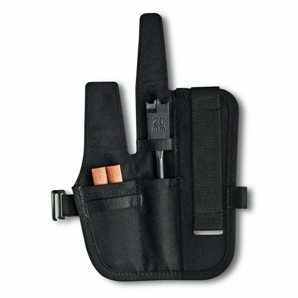 The pouch is a tough, durable 600D polyester, and comes with a 2 cm flat drill with a standard 1/4-inch shaft, as well as two sharpening stones. It accommodates the Venture Pro and its carrying system, as well as the drill and sharpening stones.