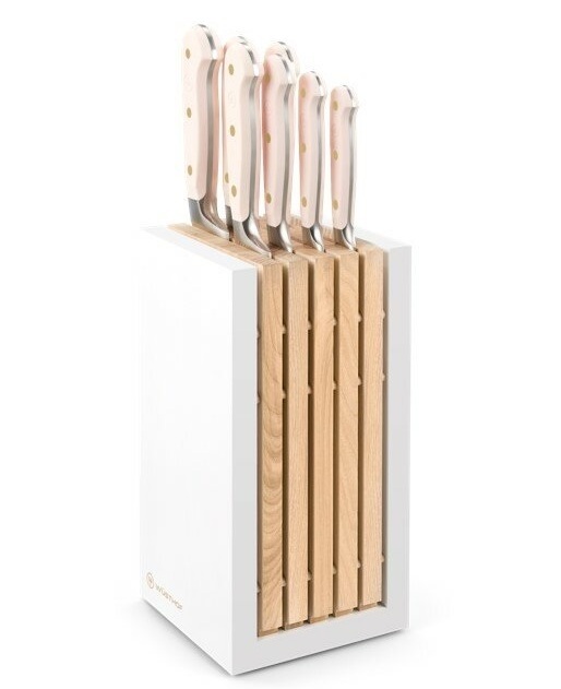 The knife block itself is a real gem, with its elegant oiled ash insert. It contains a complete assortment of Wusthof Classic Colour Pink Himalayan knives, including :