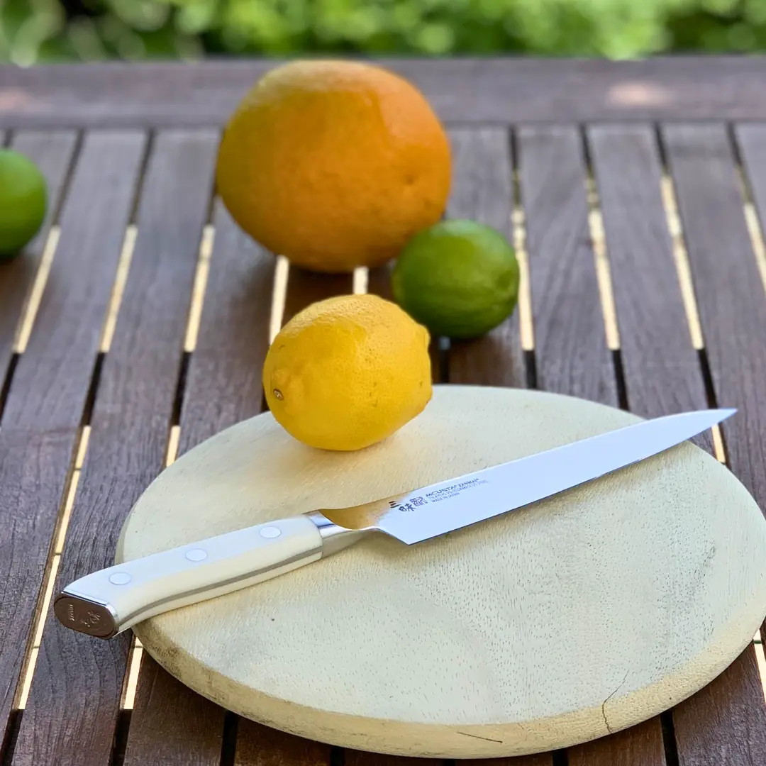 The universal knife from the Japanese brand Mcusta Zanmai is a versatile tool that allows you to both peel vegetables and fruits. Thanks to its widened blade, the knife is also suitable for cutting larger items and excels at chopping or mincing herbs. The knife features a handle made of white Corian.