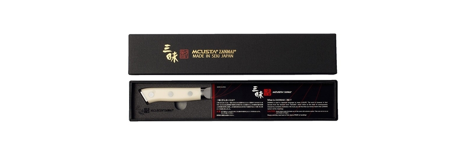 This collection is characterized by excellent cutting properties and a distinctive, minimalist design, perfect for modern kitchens. The VG-10 core wrapped in 32 layers of Japanese steel creates the characteristic "Damascus" pattern on the blade, which beautifully complements the riveted handle made of white Corian composite. Mcusta Zanmai A Japanese brand specializing in knife production since 1964. "Mcusta" stands for luxury, which translates into meticulous attention to detail in the products of this manufacturing company. Modern technologies, such as laser-cutting of blades and cold forging, combined with manual assembly, result in some of the best knives in the world.