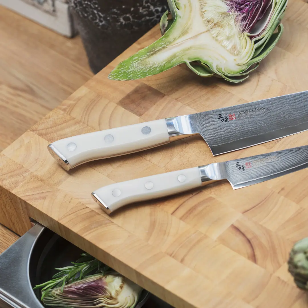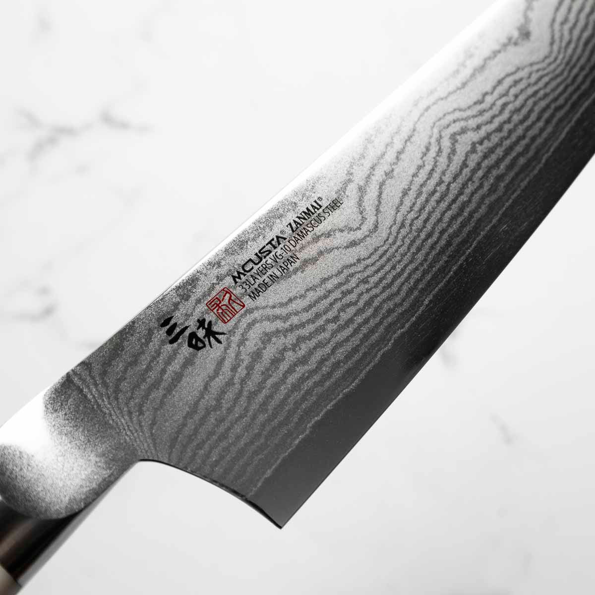 This collection is characterized by excellent cutting properties and a distinctive, minimalist design, perfect for modern kitchens. The VG-10 core wrapped in 32 layers of Japanese steel creates the characteristic "Damascus" pattern on the blade, which beautifully complements the riveted handle made of white Corian composite. Mcusta Zanmai A Japanese brand specializing in knife production since 1964. "Mcusta" stands for luxury, which translates into meticulous attention to detail in the products of this manufacturing company. Modern technologies, such as laser-cutting of blades and cold forging, combined with manual assembly, result in some of the best knives in the world.