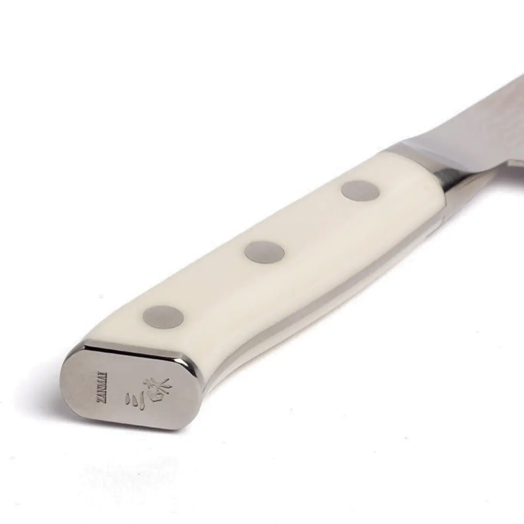 The chef's knife from the Japanese brand Mcusta Zanmai is a must-have for enthusiasts of the finest Japanese knives. This tool boasts incredible sharpness and a unique design, making it perfect for chopping herbs, slicing meats, and vegetables, and thanks to its wide blade, it's ideal for easy ingredient transfer. The knife features a handle made of white Corian.